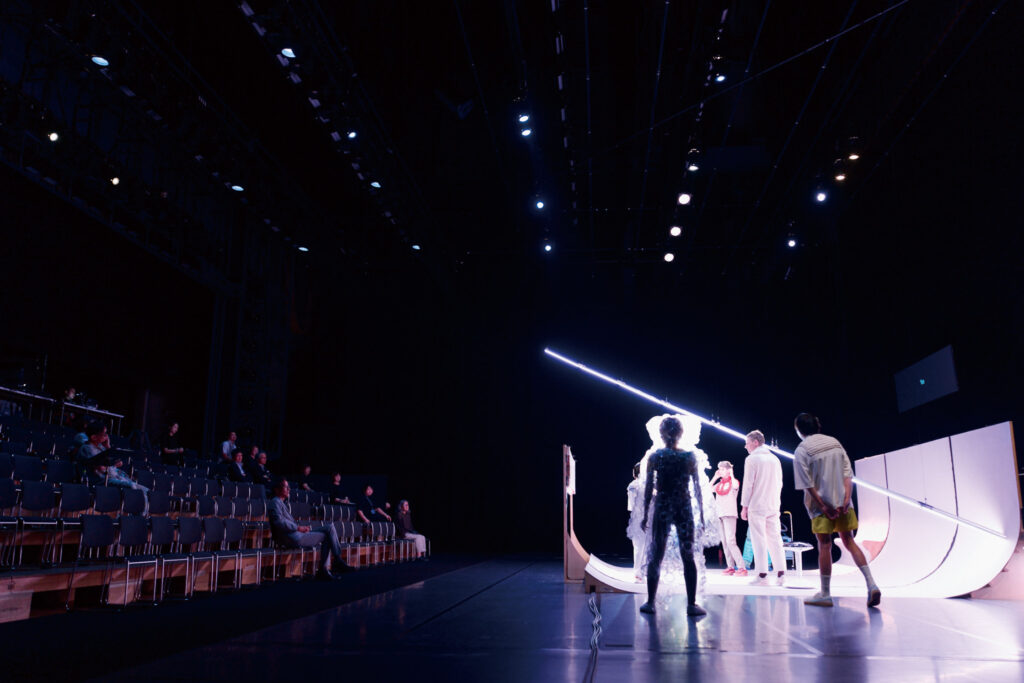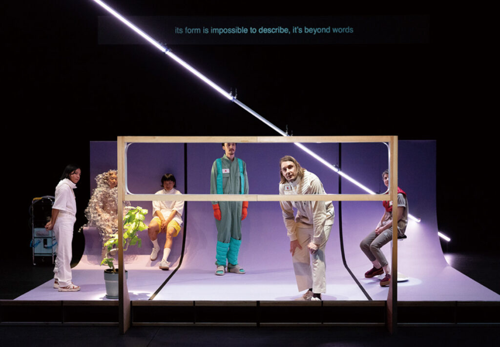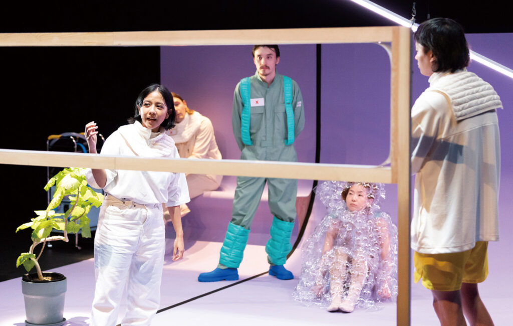 とある言語の衰退を食い止めるために、宇宙船イン・ビトゥイーン号に乗り込んだ4人の乗組員と一体のアンドロイド、そして銀河の旅の途中で遭遇する地球外生命体。宇宙を漂いながら、重大なミッションを遂行するために言葉をめぐる対話が宇宙船内で繰り広げられるSF演劇。日本語を母語としない4人のノンネイティブの俳優と2人のネイティブの俳優によって演じられる独特な世界観。それは、発音や文法の「正しさ」ではない、演劇における日本語の可能性をひらくためにワークショップを実施し、その中で出会った俳優とともにつくりあげてきたものです。2年ぶりとなる日本での上演は、熊本県立劇場でスタートを切りました。この日のために特別にセッティングされた舞台上の観客席の目の前で、臨場感と没入感のある演劇が披露されました。