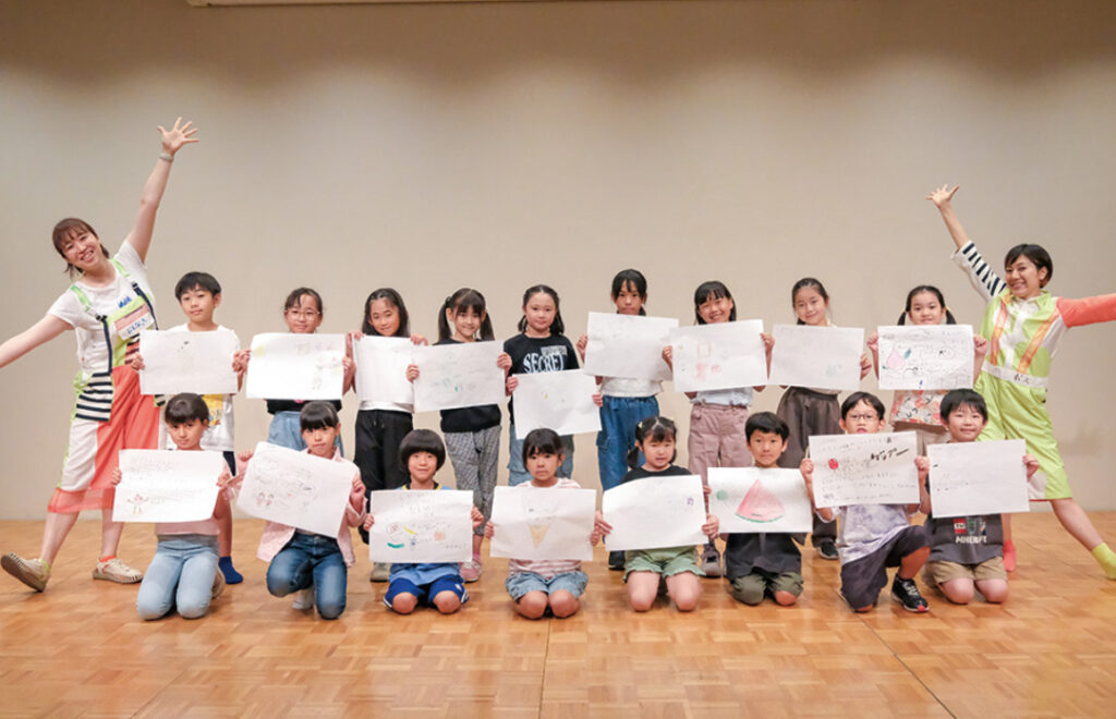 学生クリエイターたちの活動がすすむ中、7月13日にはこどもパフォーマーの開校式を実施しました。はじめて顔をあわせる小学生たち。ダンサーの古家優里さんと仁科幸さんによる歓迎のダンスを緊張の面持ちで観る参加者たちでしたが、名前を呼びあうゲームでぐっと距離が近くなりました。その後、舞台づくりについての説明を受け、後半は、「もし食べ物がキャラクターだったら?」をテーマに、好きな食べ物や嫌いな食べ物について考えました。色や着ている服、必殺技などを楽しく絵や言葉にしていきます。このクリエイションがその後の自分のダンスや衣裳つくりのベースになっていきました。