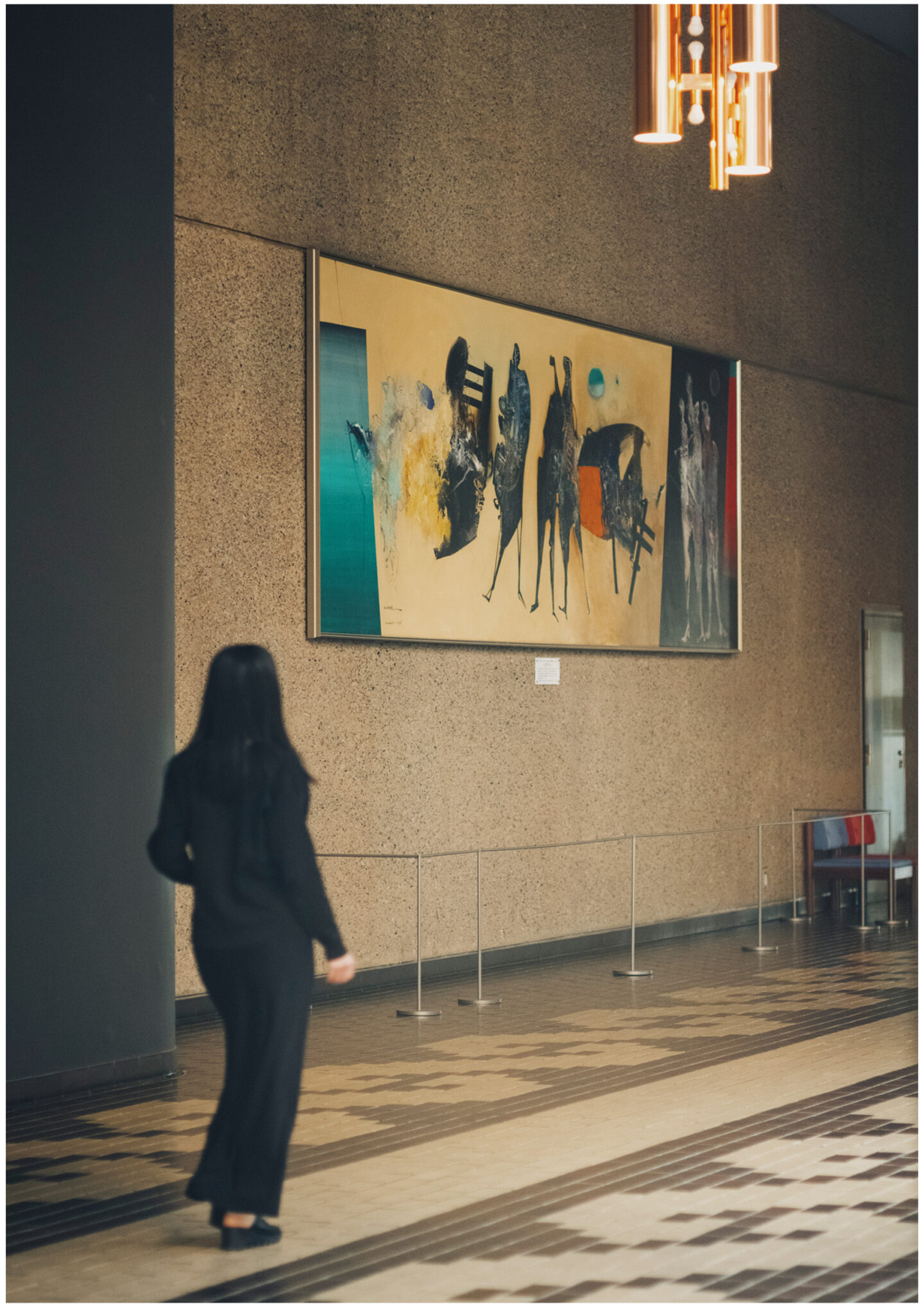 モール(廊下)に掛けられている横長の大きな絵画は、熊本県宇土郡不知火町(現・宇城市)出身で、ブラジルを代表する抽象画家、マナブ間部の作品です。1983年、熊本市のニュースカイホテル(現・ANAクラウンプラザホテル熊本ニュースカイ)に25階建ての東館が増設されたとき、ロビーの壁面に収まるように描かれたのがこの絵画。大胆な色面と繊細な線で描かれた、傑作の一つです。2005年のホテル改修以降、縁あって熊本県立劇場に貸与されることとなりました。