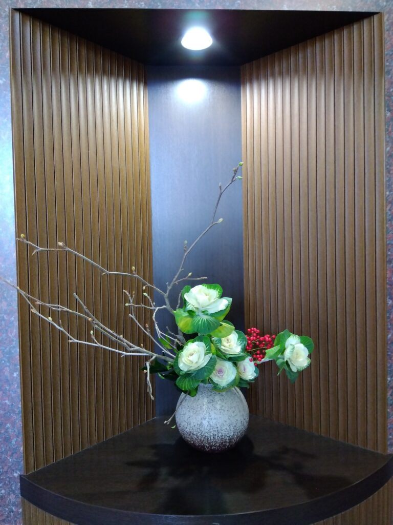 いつも欠かさず四季折々の生け花が展示されみなさまをお迎えしています。
