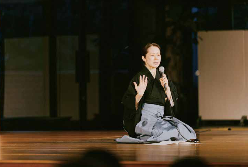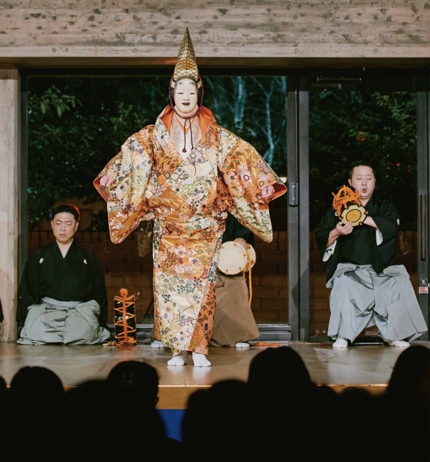 日常的な動作や会話で人間のおかしみを描き出す「狂言」と、能面をつけた舞いと音楽を巧みに織り交ぜ、物語を叙情的に描く「能」は、兄弟のように発展してきた日本の伝統芸能です。公演に際して観客にその背景と、今回の見どころをわかりやすく伝える解説が行われました。その間に窓の外に設置された篝篭(かがりかご)に黒子が火をくべ、これから待ち受ける世界への期待感が増していきました。