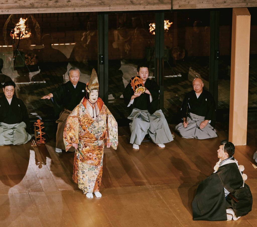 最初の演目は、狂言「樋の酒」。物語は、主人(あるじ)に留守を仰せつかった太郎冠者が、酒蔵の番をする次郎冠者に酒を求めるやり取りを軸に展開されます。人間の欲望を軽妙なタッチで描く代表的な狂言で、観客の心を柔らかくほぐしました。能「船弁慶(ふなべんけい)」は、平家と源氏の争いを背景にした武士の悲哀と、霊と人間の交錯する世界が描かれます。義経や弁慶、静御前が登場する人気の高い能で、荒れ狂う海を表す激しい囃子方の演奏のなか、長刀を振るいながら荒々しく舞う後シテ·知盛の姿は圧巻。普段のホール公演とは異なり、内と外、舞台と観客を隔てるものが溶け、ひとつの風景となり、多くの人にとって忘れがたい公演となりました。