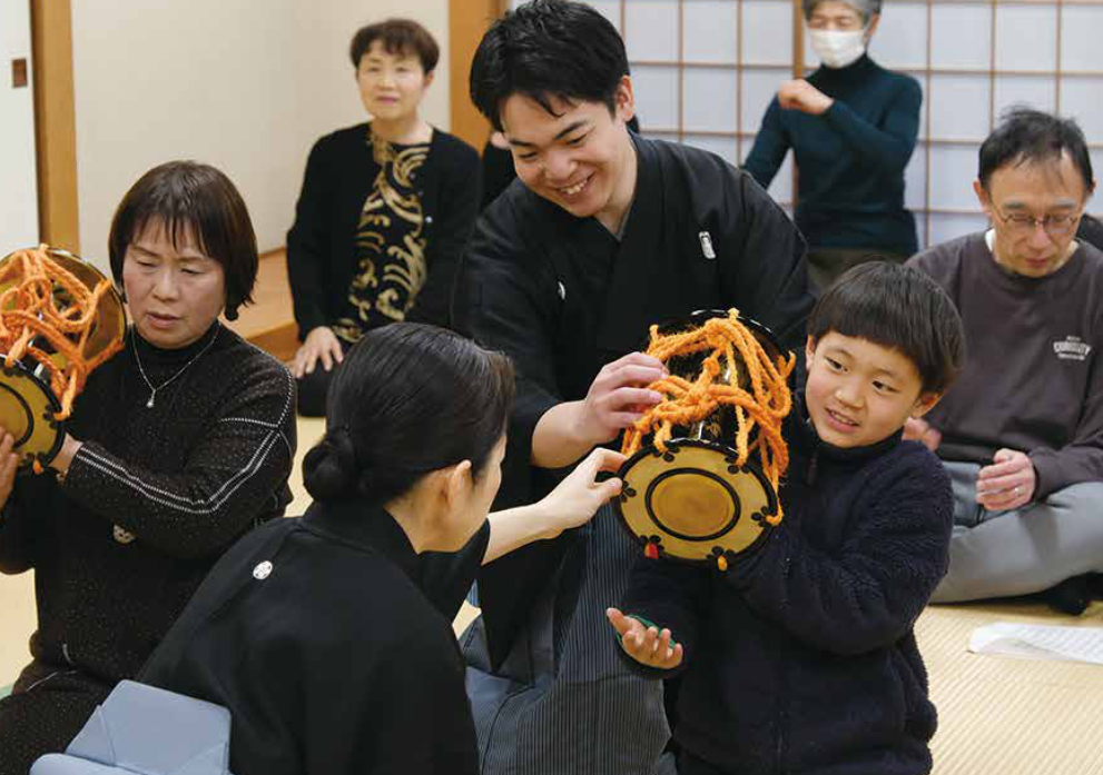 また、関連企画として翌日に能楽ワークショップを開催。喜多流能楽師の狩野了一氏を講師に迎え、能面や装束に触れながら、能「船弁慶」をより深く理解するためのレクチャーと体験が行われました。15人の参加者が集まり、能の台本を使用した「謡」や「仕舞」の体験や小鼓のお稽古など、伝統芸能を身近に感じるひとときを過ごしました。