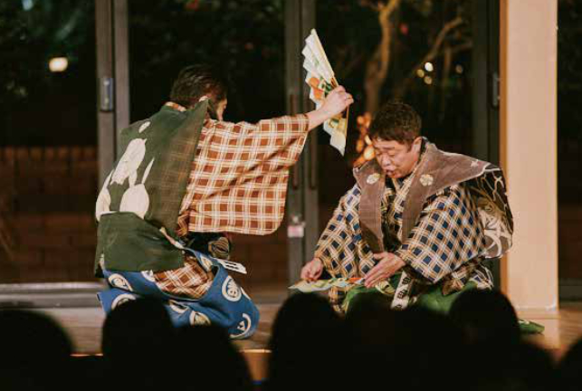 日常的な動作や会話で人間のおかしみを描き出す「狂言」と、能面をつけた舞いと音楽を巧みに織り交ぜ、物語を叙情的に描く「能」は、兄弟のように発展してきた日本の伝統芸能です。公演に際して観客にその背景と、今回の見どころをわかりやすく伝える解説が行われました。その間に窓の外に設置された篝篭(かがりかご)に黒子が火をくべ、これから待ち受ける世界への期待感が増していきました。